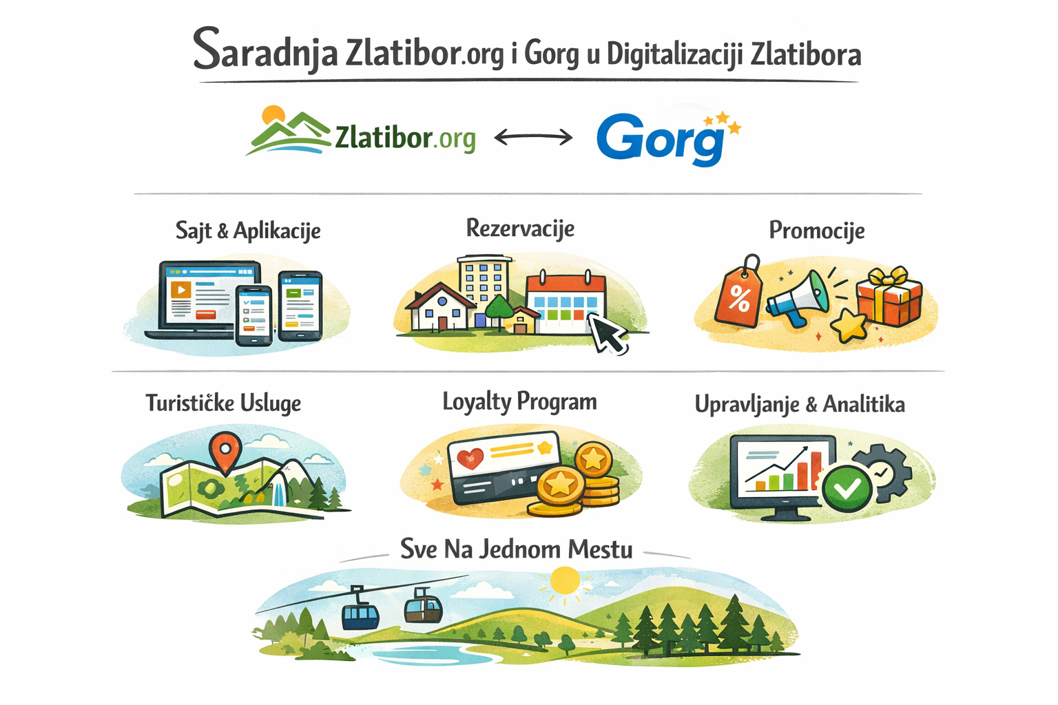 Spojem medijske promocije, tehnoloških rešenja, aplikacija, rezervacionog sistema i programa lojalnosti, Zlatibor.org i Gorg zajedno rade na tome da Zlatibor postane još dostupniji, organizovaniji i savremeniji turistički centar, u kome su informacije, rezervacije i usluge povezane u jedinstveno digitalno iskustvo.